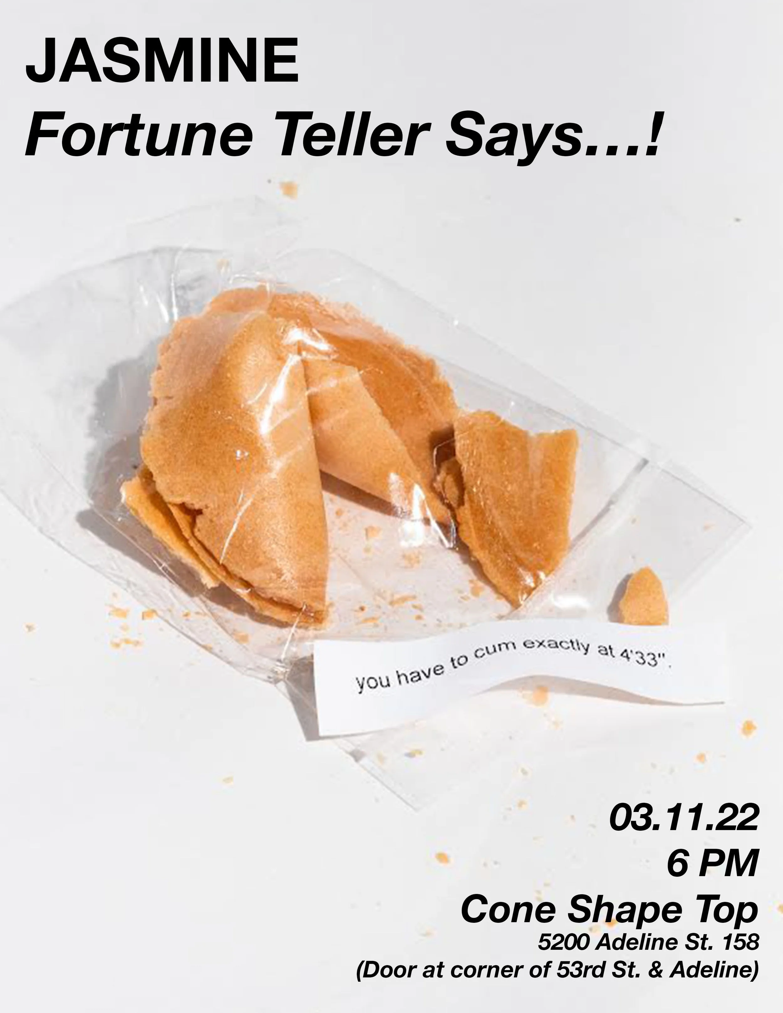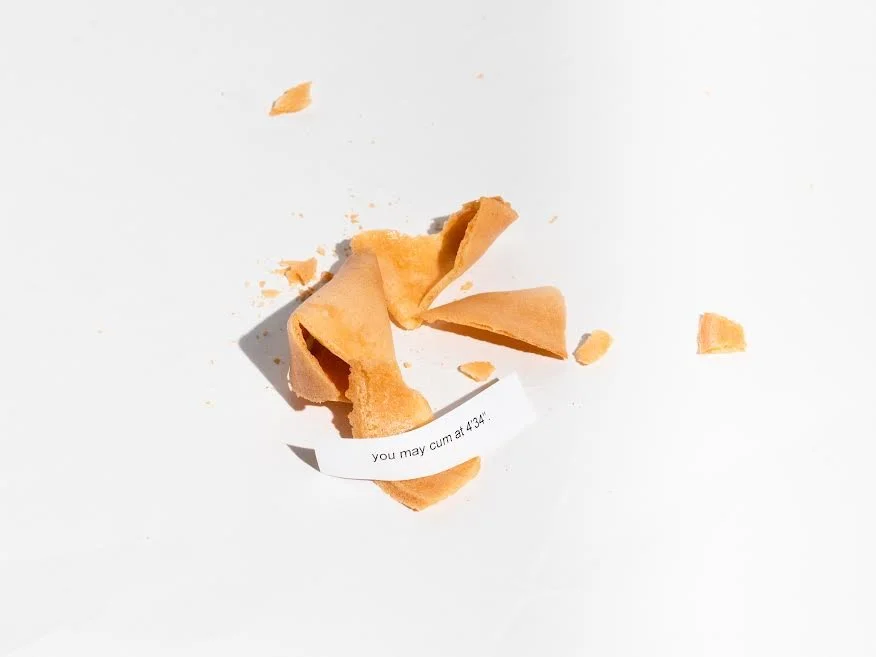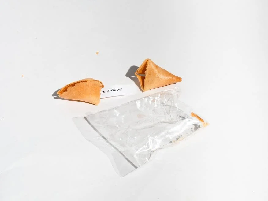 An exhibition showcasing an interactive installation that is made out of a plexiglass box and fortune cookies. Relating the time period before orgasm and the forced silence 4’33’’, Jasmine borrowed the idea of John Cage so she put down the sentence “You have to cum exactly at 4’33’’ ” - this sentence was first conceived for an instructional sexual message to the lover of Jasmine’s friend. Realizing how profound this comparison is, she decided to make this sentence into actual objects. Thought about making them into neon, Jasmine eventually made them into fortune cookies with other two variations - “you may cum at 4’34’’”, “you cannot cum”.